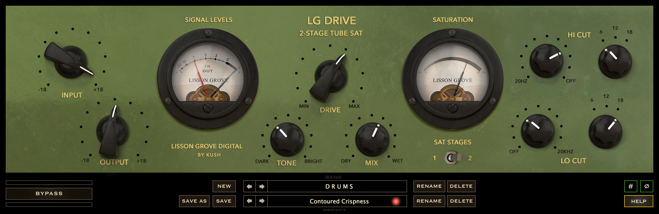 LG Drive achieves dramatic shifts in tone with minimal objectionable artifacts through the use of gentle, cascading phase-coherent filters (not to be confused with phase-linear filters, which are generally unkind to low-frequency transients). Our custom filters can be made increasingly steep without invoking unwanted resonant bumps or intense phase cancellations at the crossover points when blended in parallel. Use these custom Hi and Lo Cut filters in tandem with the Drive and Tone (tilting eq) controls to isolate the emotional heart of the sound, texturize it, and blend it with the unprocessed input to shape the resulting colorations. Or, simply leave the ancillary controls untouched and use nothing but Drive to infuse your tracks with the classy harmonic mojo of Lisson Grove’s tube and transformer circuits.