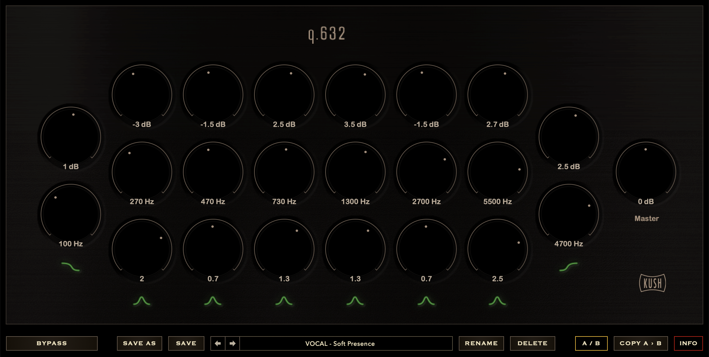 q.632 is the first Kush product to leverage Magpha’s EQ dsp, adding extended gain range, an updated Preset Manager and Apple Silicon compatibility. Magpha EQ’s core dsp (and tightly phased sound) remains untouched, and will slowly become incorporated into all of Kush’s products.